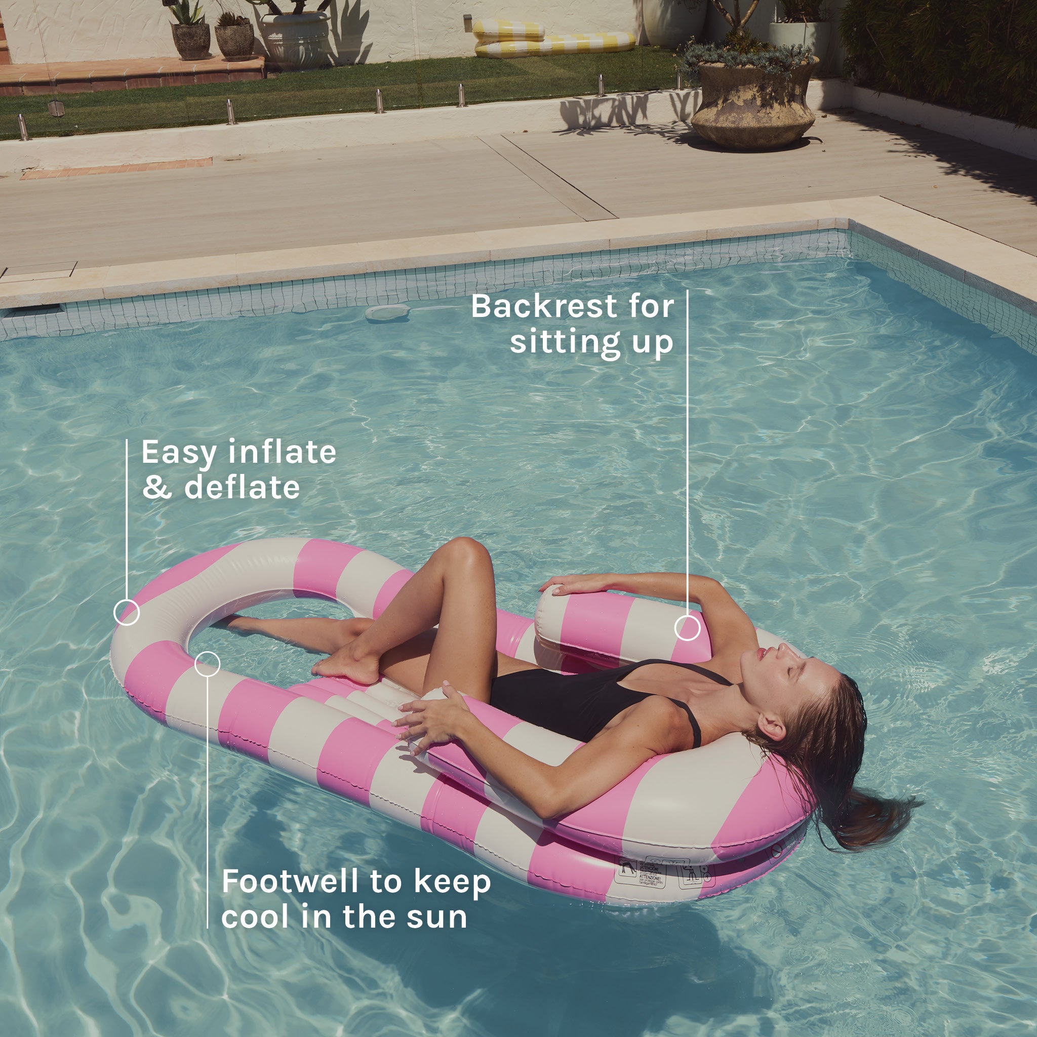 The float for the perfect sunshine siesta. Laze in this floating lounger, with an inflatable headrest and a foot well to keep you cool whilst you relax.
