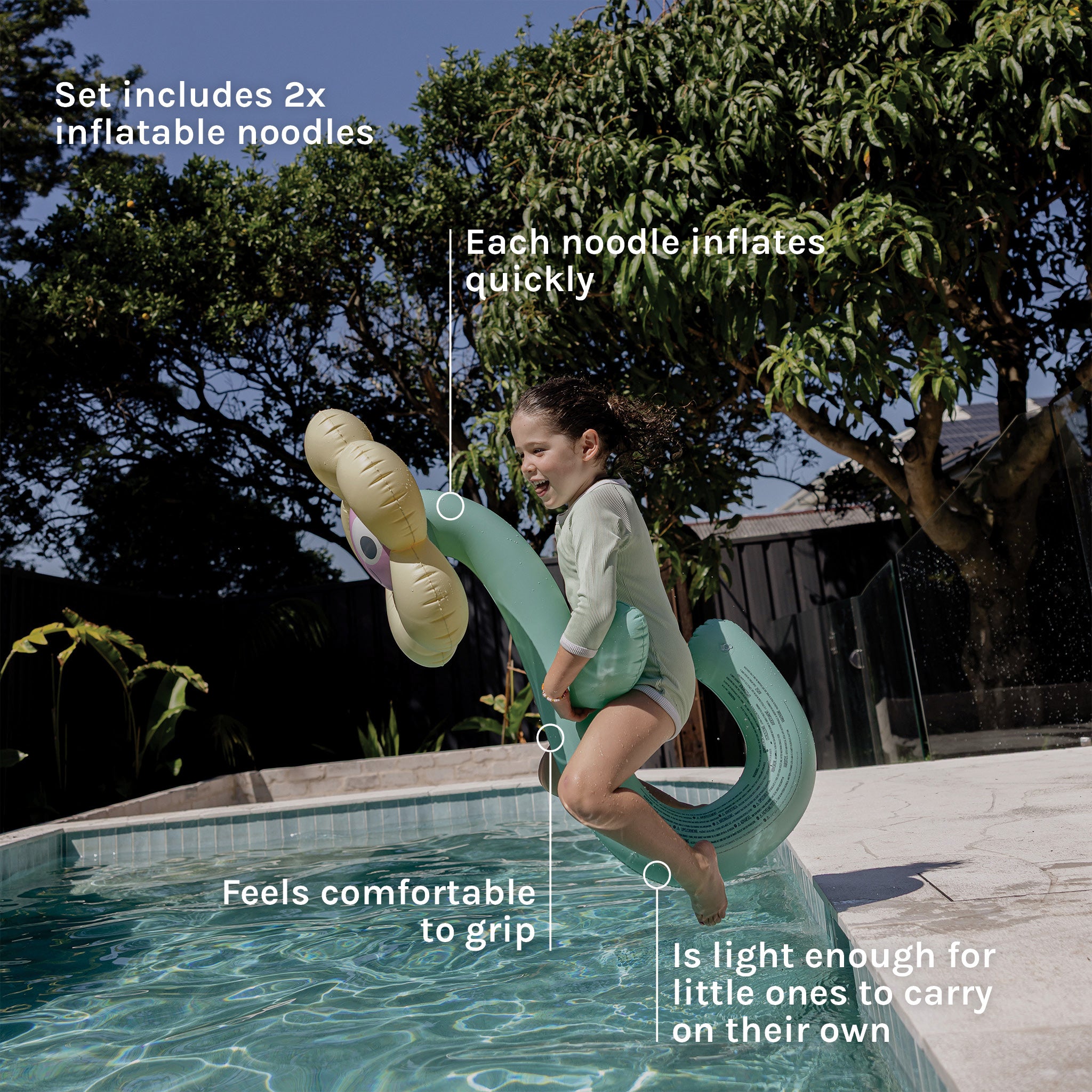 - Set includes 2x inflatable noodles.