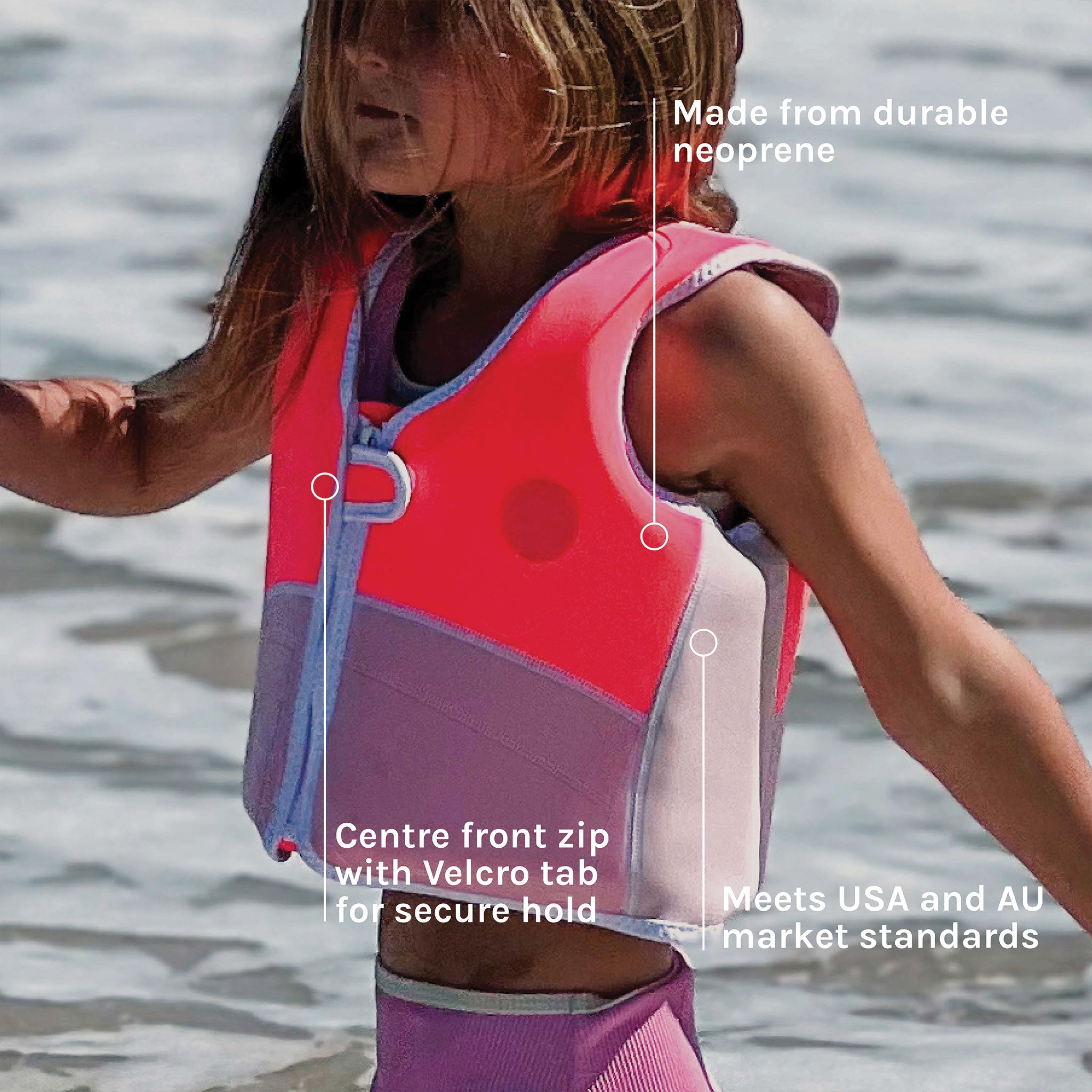 The Kids Swim Vest 3-6 features durable neoprene for warmth and buoyancy. Also includes a secure zip, playful 3D back detail, and helps build confidence and swimming skills in young adventurers.