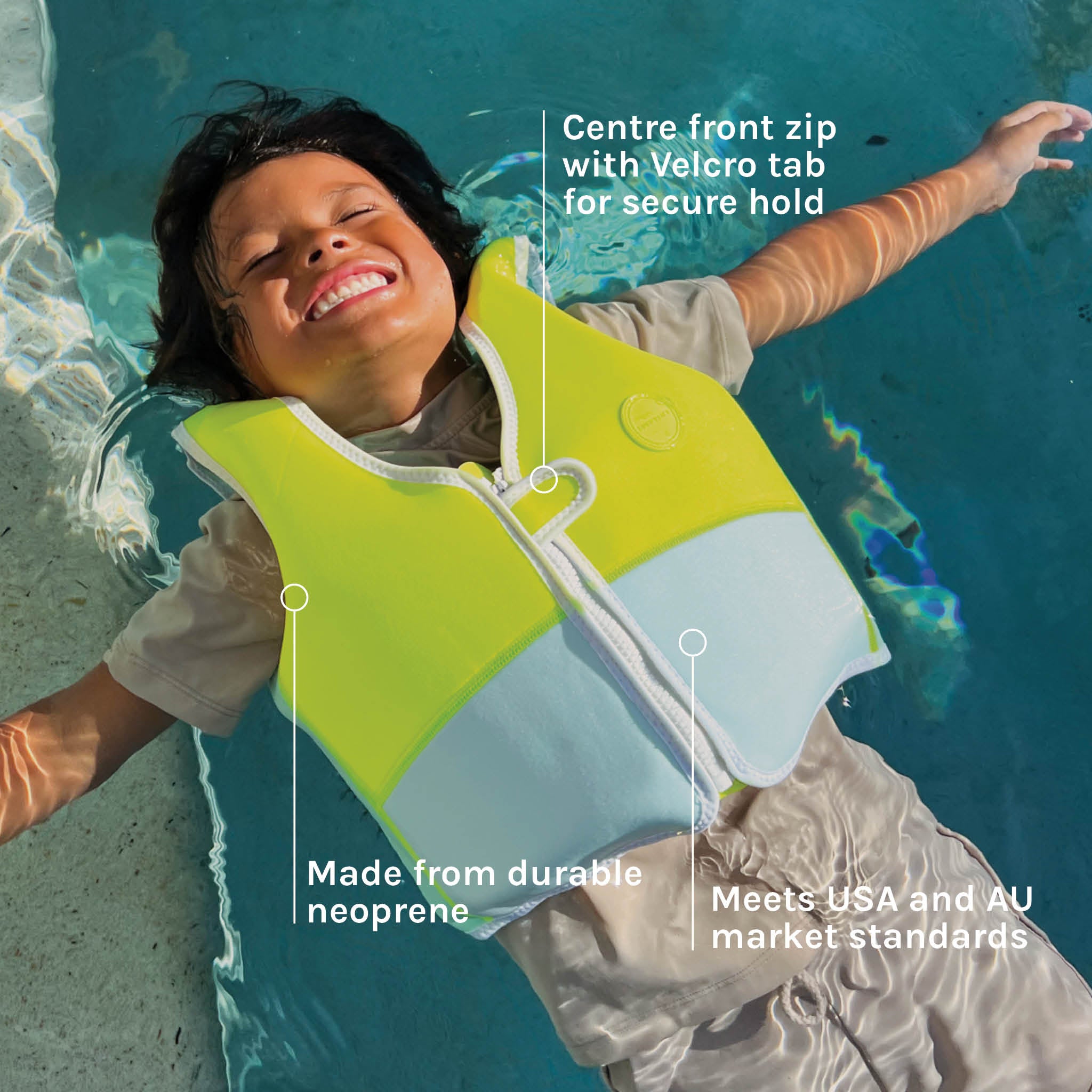 The Kids Swim Vest 3-6 features durable neoprene for warmth and buoyancy. Also includes a secure zip, playful 3D back detail, and helps build confidence and swimming skills in young adventurers.
