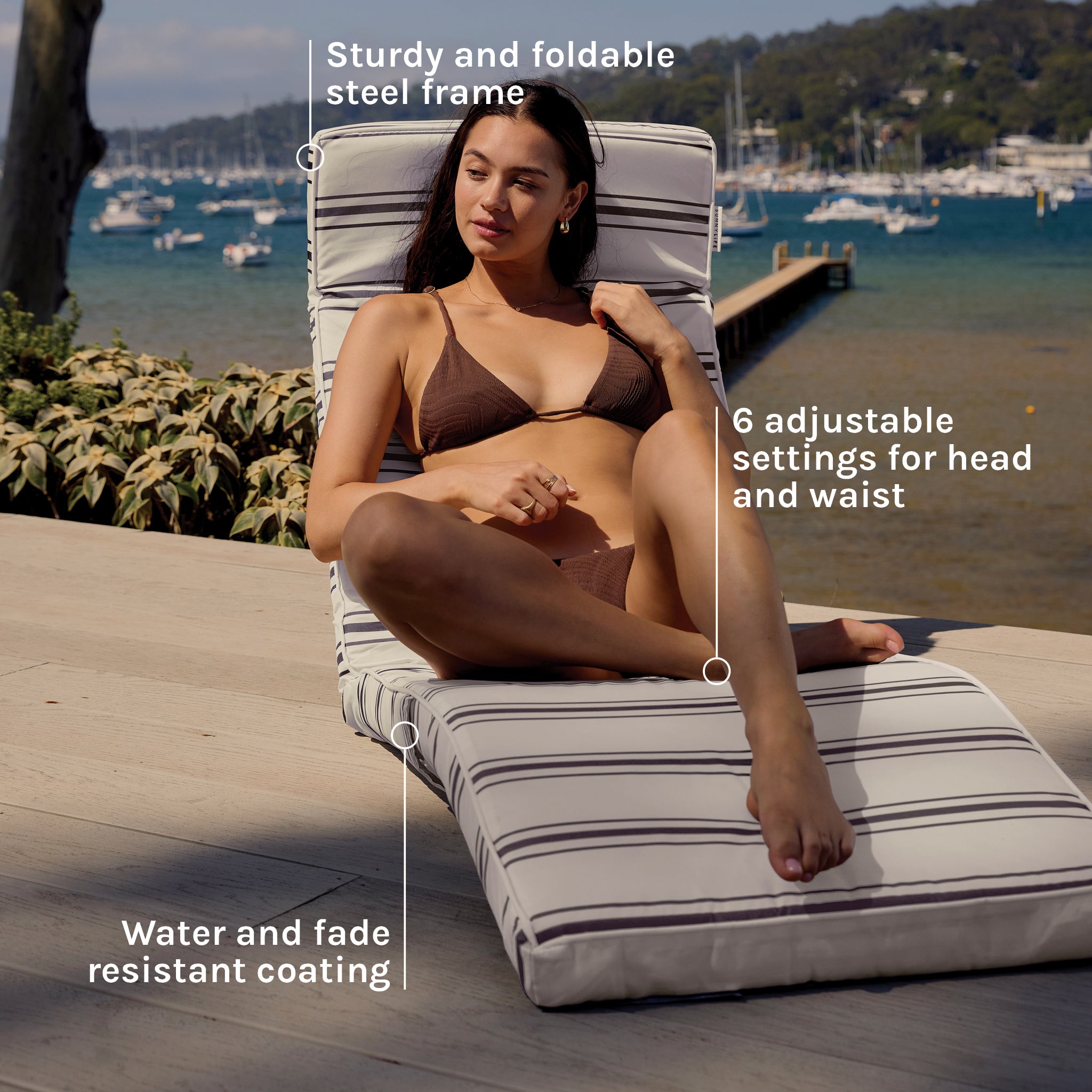 The Luxe Lounger Chair features a foldable steel frame, water-resistant fabric, and 9 adjustable settings for full-body support plus it comes with its own carry bag for effortless transport.