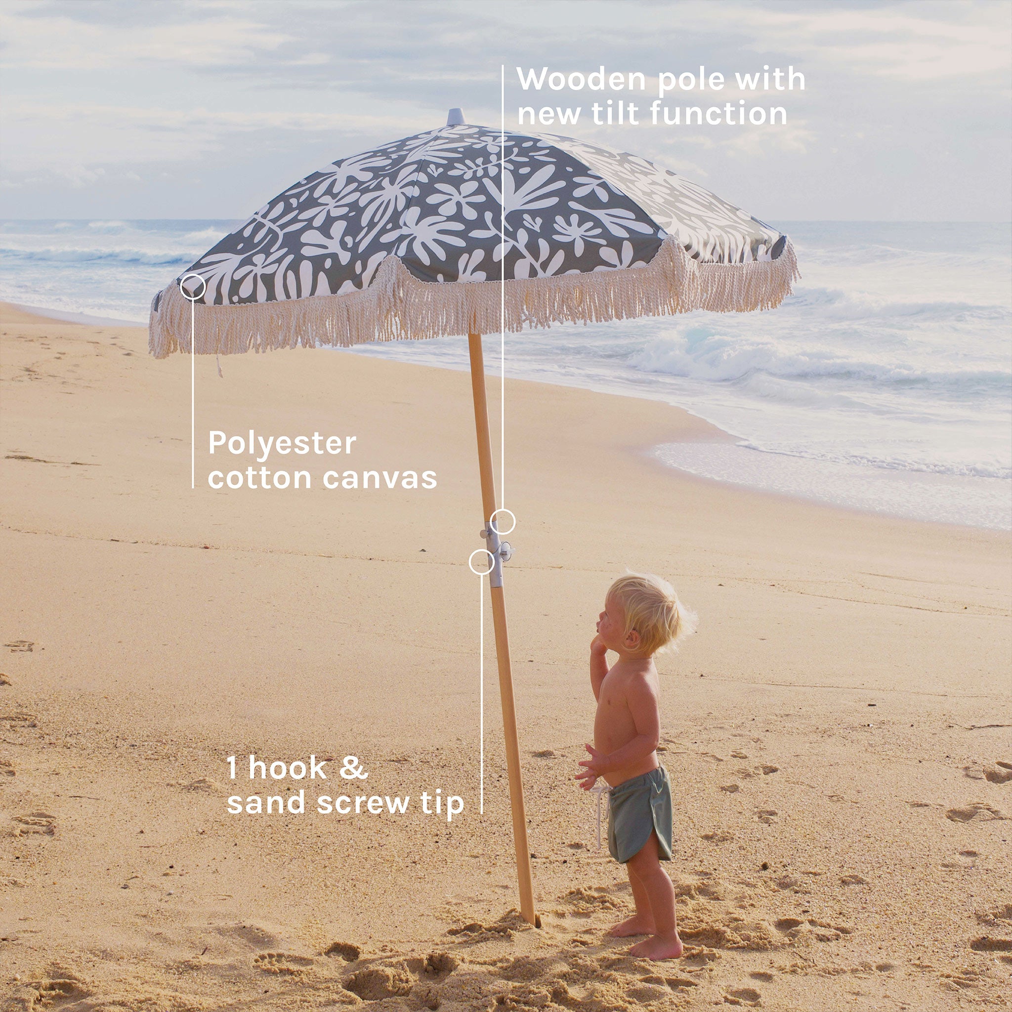 The Luxe Beach Umbrella Enjoy UPF50 sun protection with a luxe wooden pole, aluminum tilt function, and sand screw tip for secure placement. Comes with a carry bag and shoulder strap for easy transport and storage.